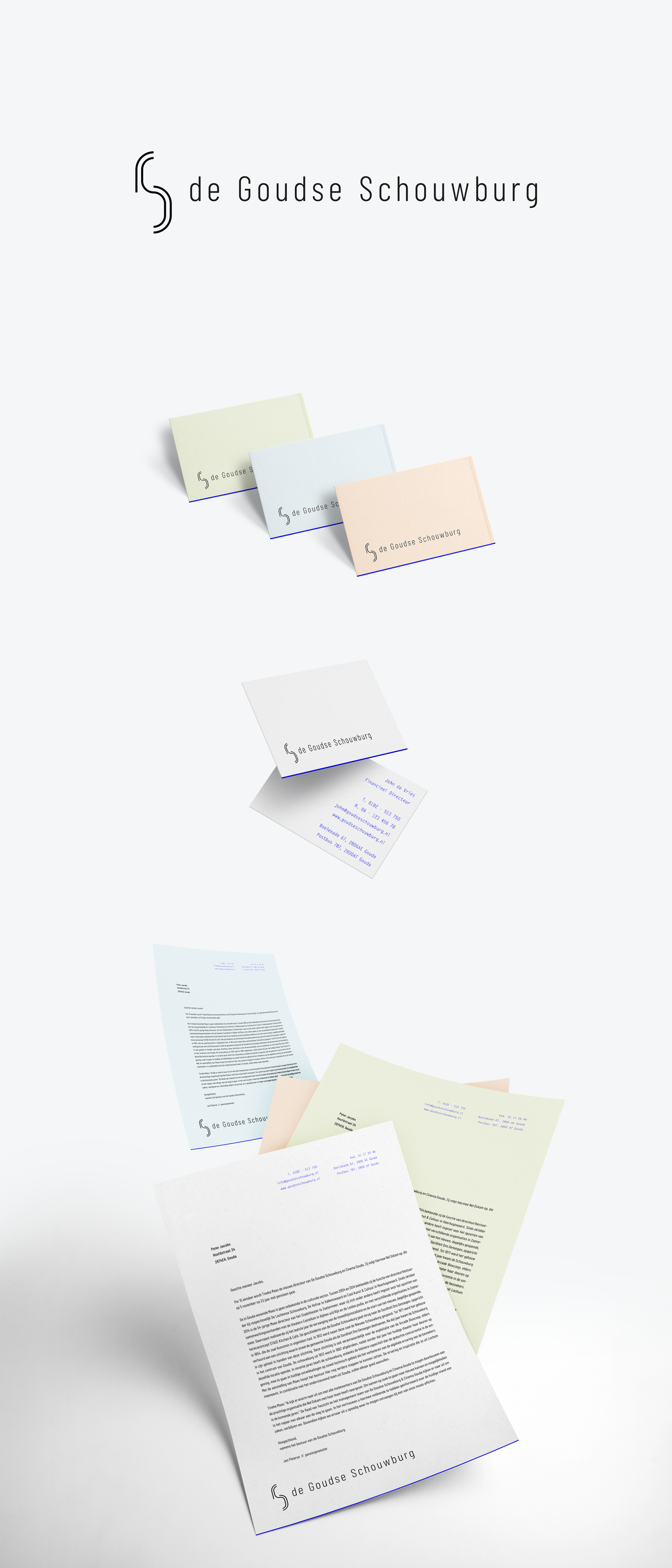Combination mark for 'de Goudse Schouwburg' (the Gouda Theater). Abstract shapes represent the letters "G" and "S", which are built out of five circles; each representing a different area of performing arts being performed at the venue.
